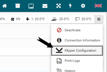 In this editor you can create and modify your Klipper configuration files. You can access this editor at any time by opening the printer context menu and clicking on Klipper Configuration.