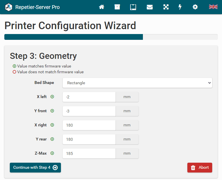 Here you can set the dimensions and bed shape of your printer. Then click Continue with Step 4 .