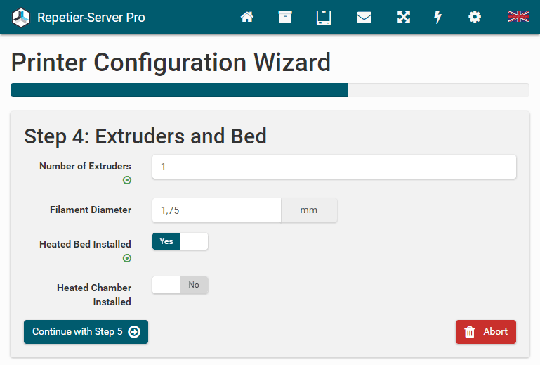 Set the number of extruders and the filament diameter. Typical filament diameters are 1,75 mm and 2,85 mm. Then click Continue with Step 5 .
