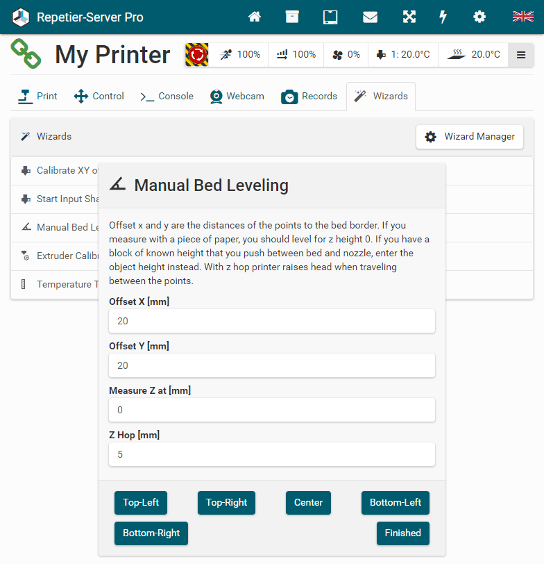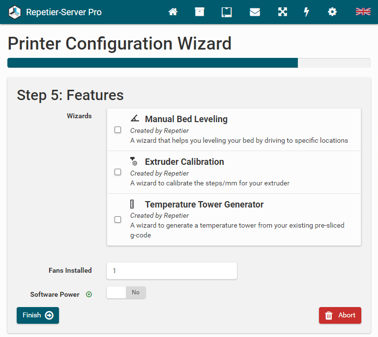 Here you can select and install some of our wizards and check, if you have installed fans and if you can enable main power with software command. Then click Finish Wizard . That's all. Now the most important values are set, and you should be able to use the printer already. To get most out of your printer, you should visit the printer settings and fine tune the remaining values, e.g. for better time prediction and easier use.