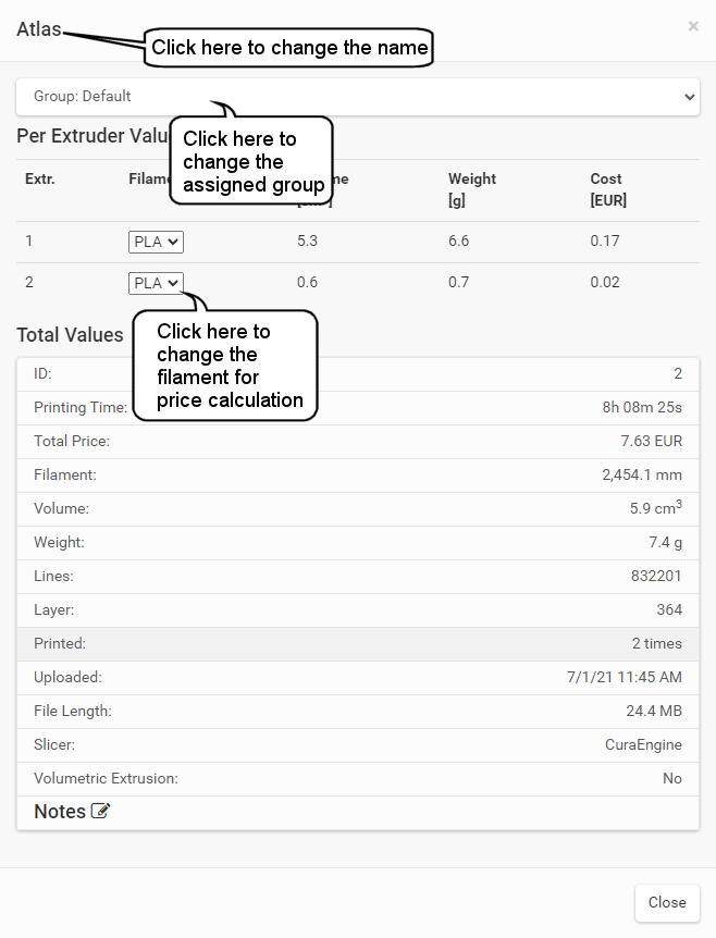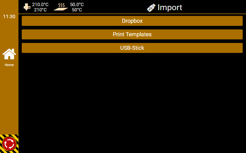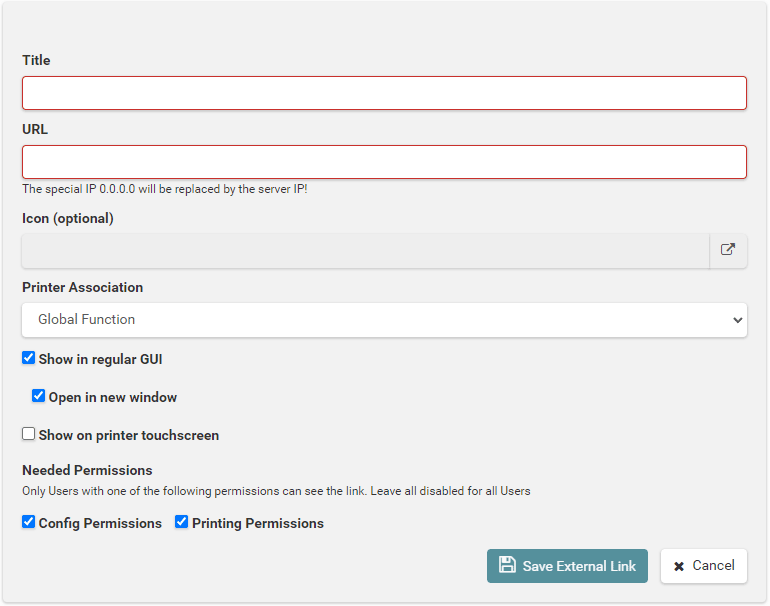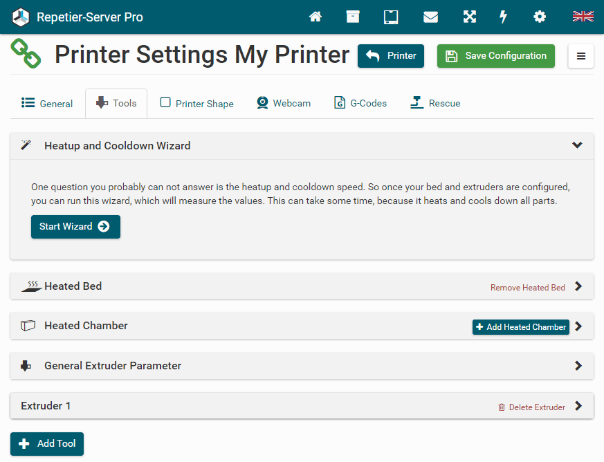 Here you can set all printer related parameter. So it is a good idea, to check these settings once your printer works. The settings are split into several categories to make navigation easier. To save the changed settings, press Save Configuration. If you leave settings without saving, you will get a security question to prevent accidental data loss. For parameters which may be difficult to understand you get a popover with detailed information when you click on the text field.