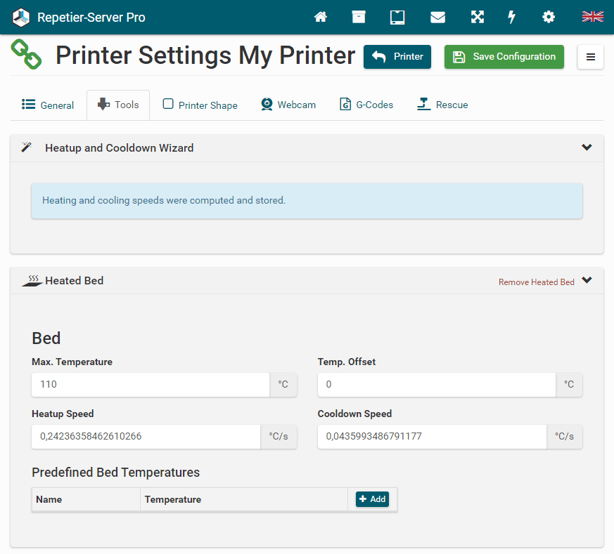 4. When you see Heating and cooling speeds were computed and stored., the wizard is finished. The exact values for Heatup Speed and Cooldown Speed are stored automatically.