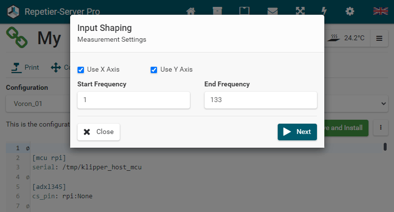 Input shaping is a pretty nice feature in Klipper and is used to resolve the printer's self-resonance and improve print quality. If you want to use input shaping we have also developed a guided wizard. For the wizard to work you need to install a supported accelerometer to your pi as described here. For this, you must first install Input Shaping once by pressing Install Input Shaping on the Klipper Configuration tab and then you can easily and conveniently perform the measurements with the wizard. Our installer automatically adds the required sections. The accelerometer defaults to an ADXL345 chip. If you use a different solution update the configuration accordingly. After installing the input shaping dependency installation, which takes some time, you have to click Restart Klipper, then you can click Start Input Shaping to start it.