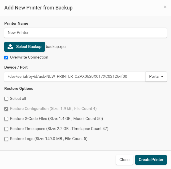 Select Overwrite Connection to select a device / port. Then select the restore options, if you just want to restore the Configuration or g-codes files, timelapses and Logs. Then click Create Printer. That's all.